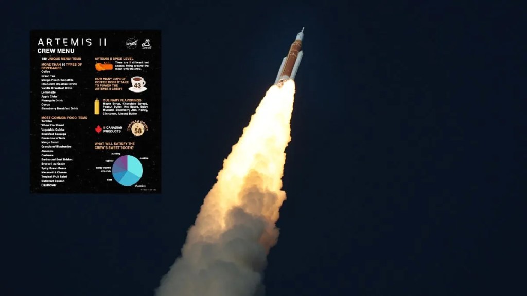 “The food flying aboard Artemis II is designed to support crew health and performance during the mission around the Moon,” NASA said. “With no resupply, refrigeration or late-load capability, all meals must be carefully selected to remain safe, shelf-stable and easy to prepare and consume in NASA’s Orion spacecraft. Food selections are developed in coordination with space food experts and the crew to balance calorie needs, hydration and nutrient intake while accommodating individual crew preferences.”